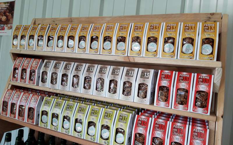 Vente directe à la ferme ou sur notre site intenet www.fermeles13fontaines.com : noix en coque ou en cerneaux décortiqués, moutarde à la