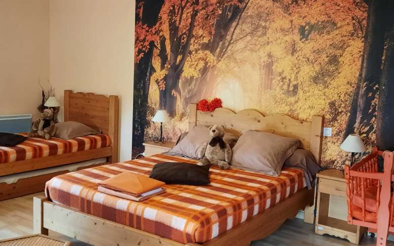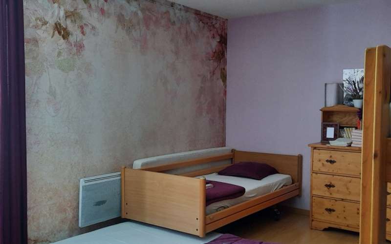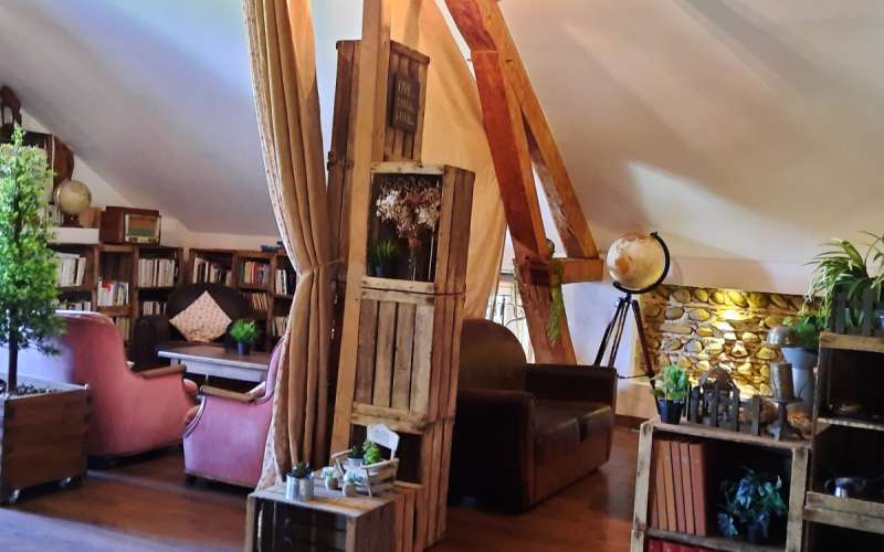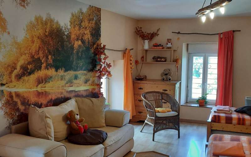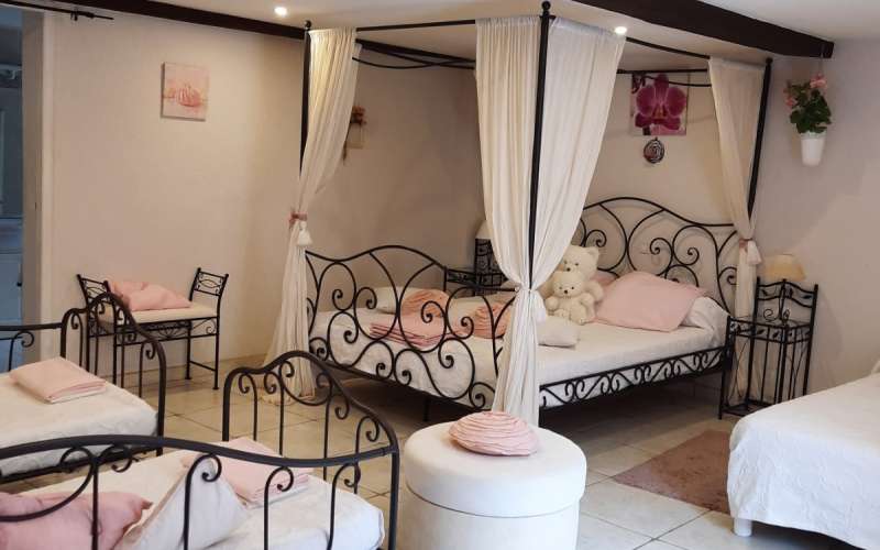 A l’intérieur : actuellement sur 2 niveaux : très grande cuisine équipée, hall d’accueil, salle de réception 80 m², 5 chambres avec salles de bain privatives, détente (salle de jeux, babyfoot, salon TV/vidéo, lecture, jeux de société...)